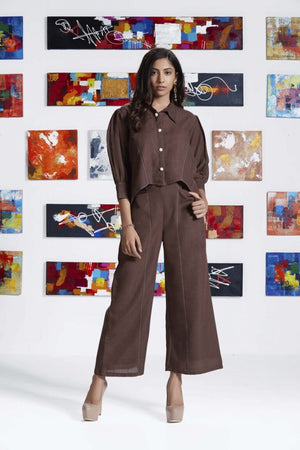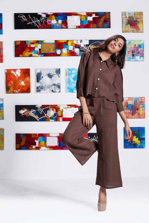 The top is high-low and features crochet buttons and an inverted pleat at the back. It has a small collar and gathered sleeves. Pants are flared and have 2 functional pockets. Entire set has running white embroidery.