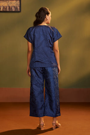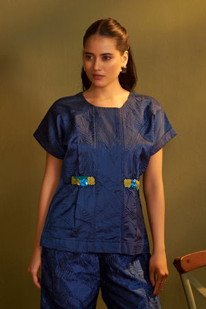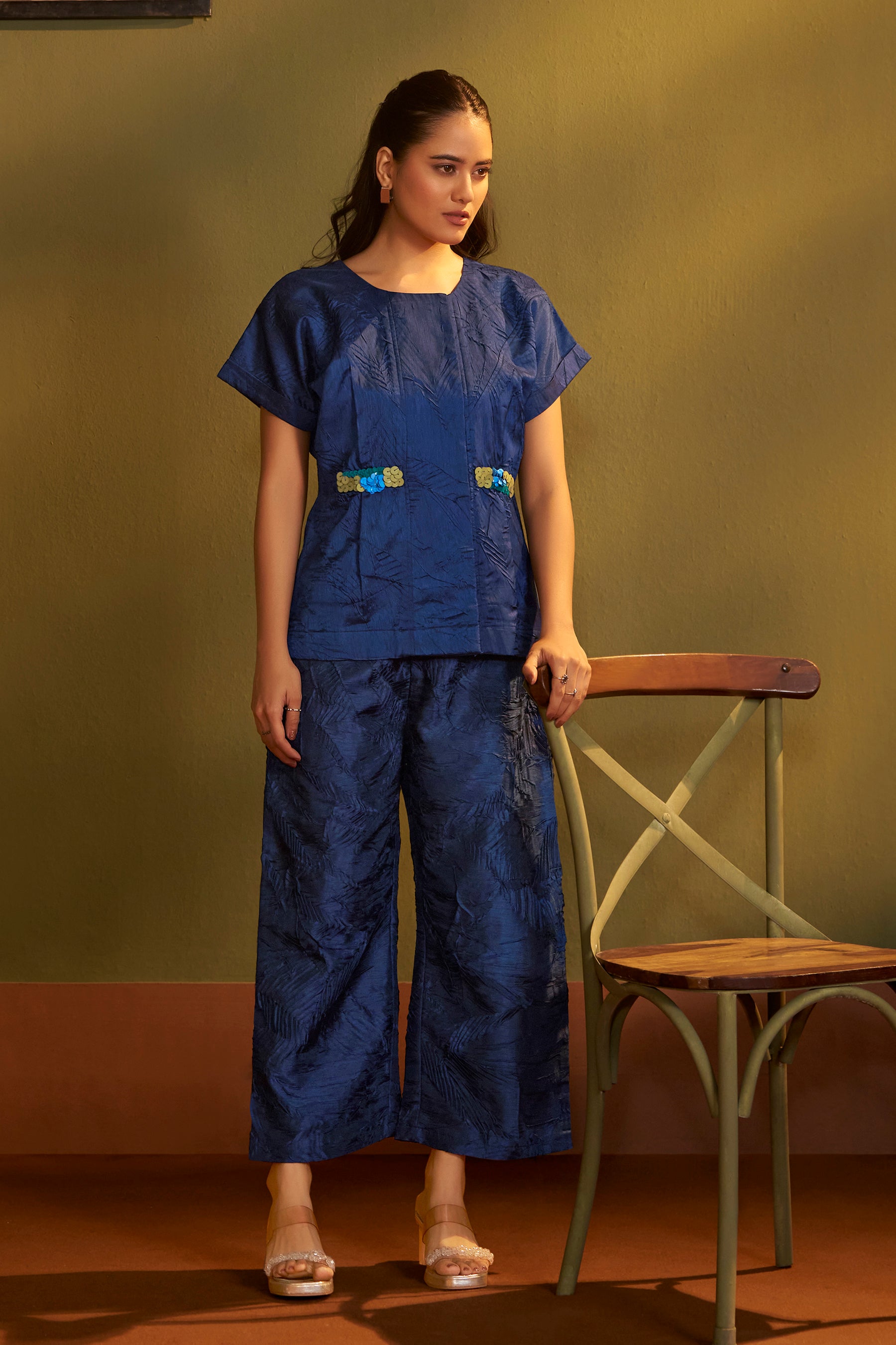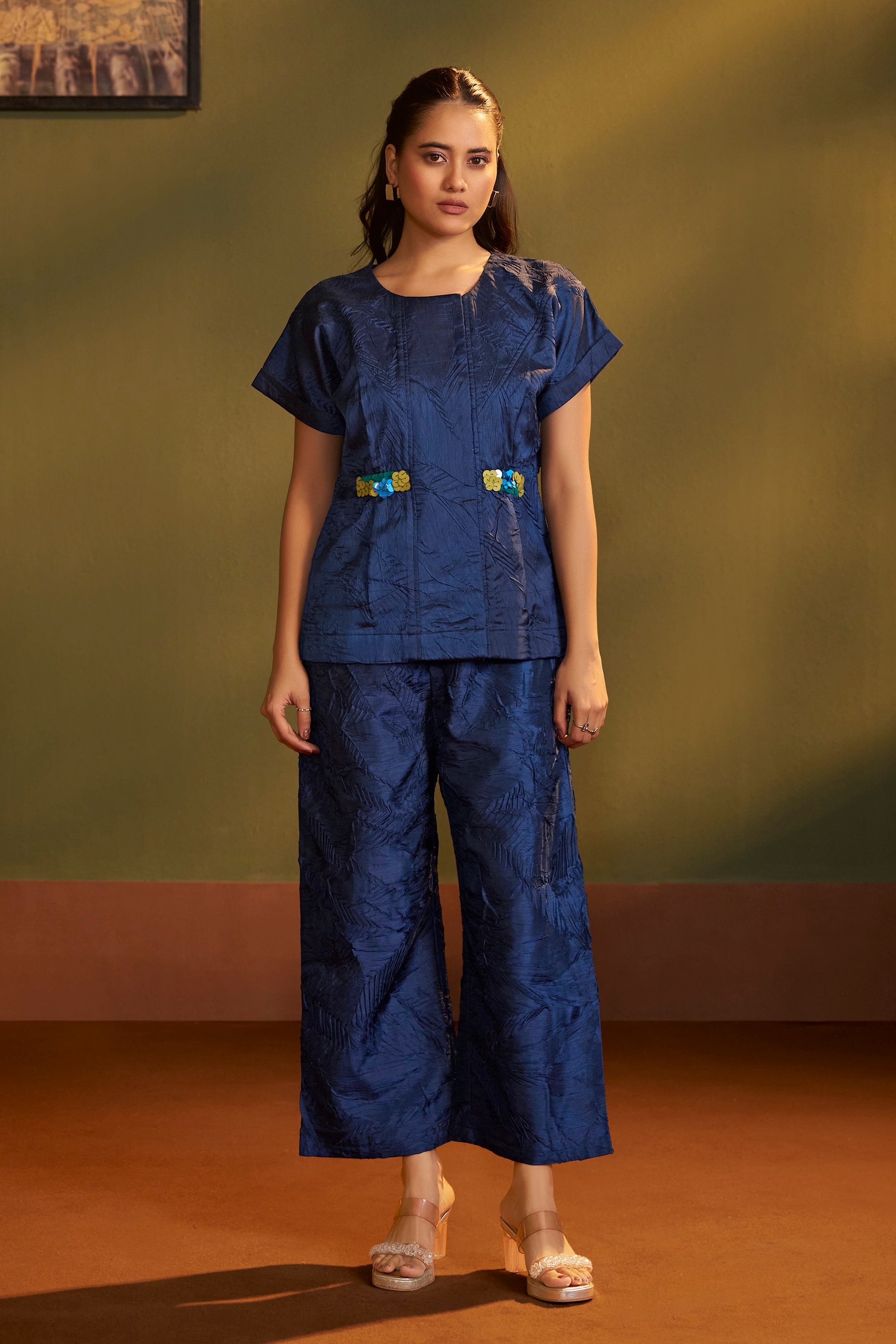 This coordinated set is crafted from rich crush viscose fabric, offering a textured finish. The top features a relaxed silhouette with short sleeves, highlighted by a three-coloured sequin detail at the waist. Paired with matching wide-leg trousers.