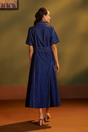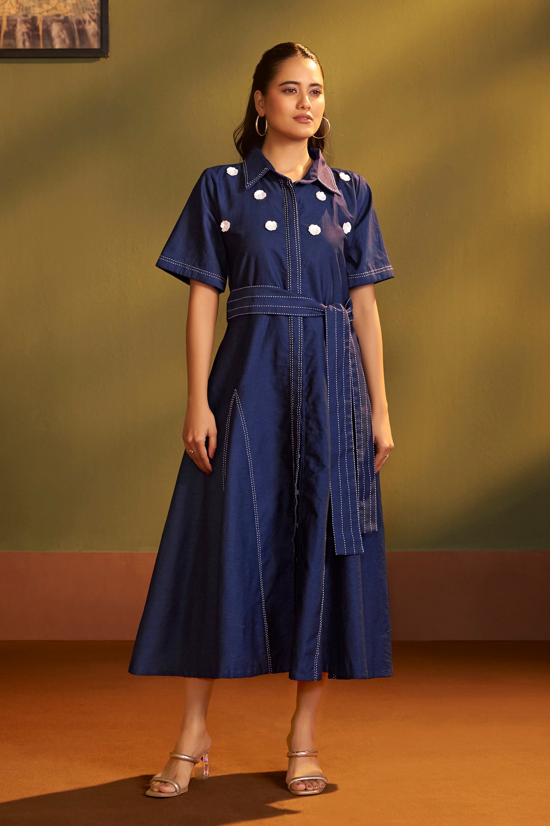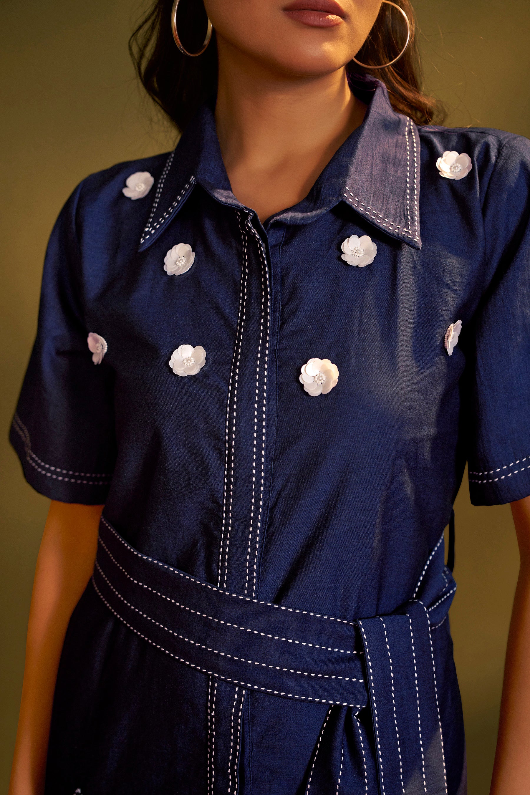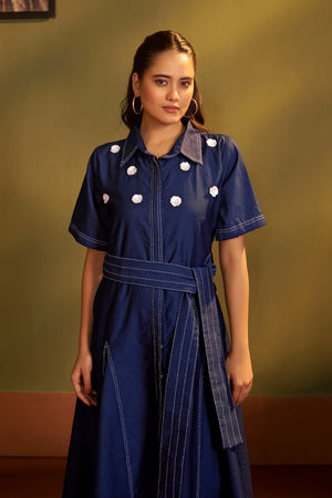 This elegant dress is crafted in rich denim fabric, designed with a structured silhouette and contrast stitch detailing for a refined finish. The shoulders are adorned with delicate hand-worked white floral motifs, Paired with a matching belted waist.