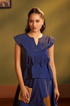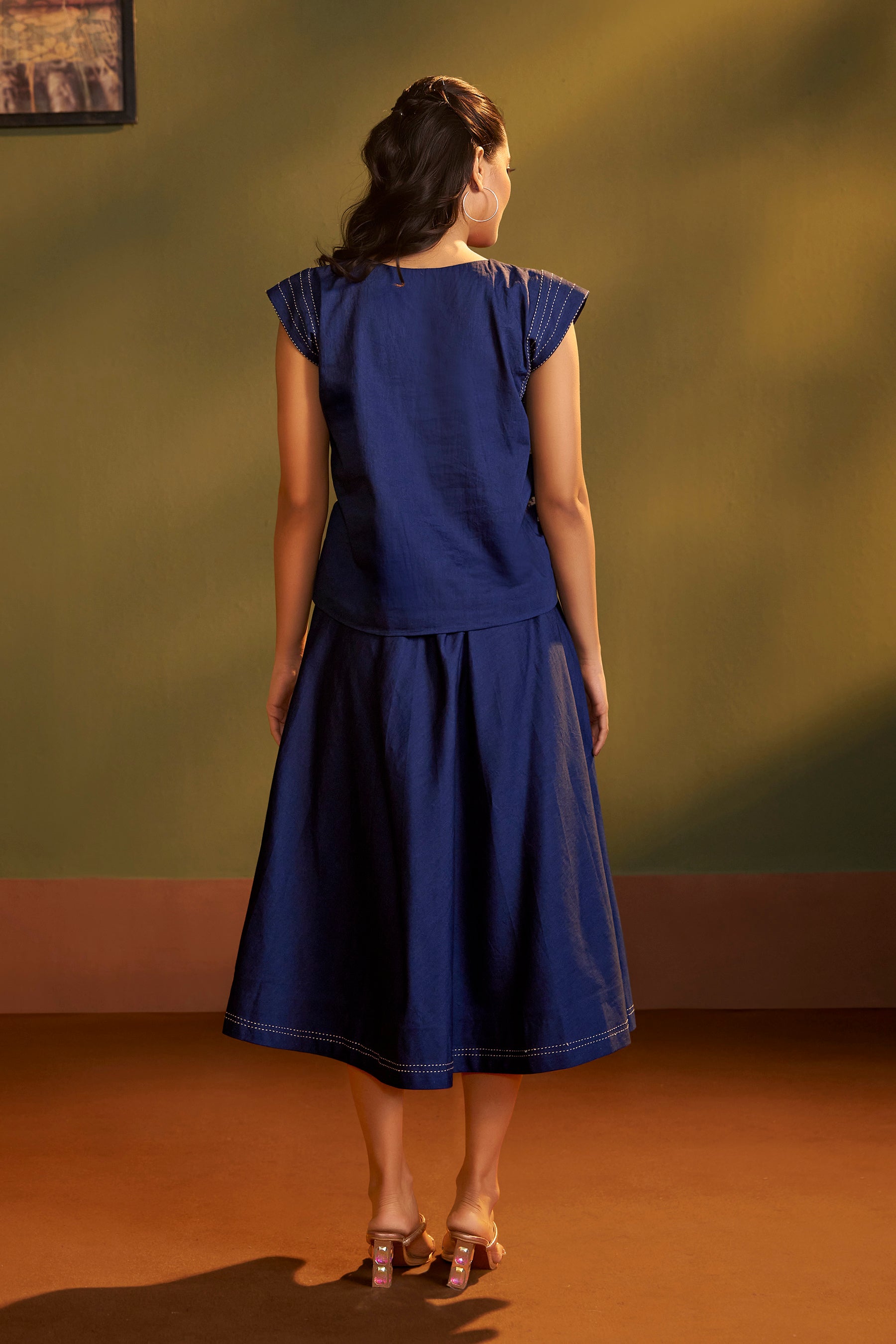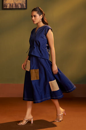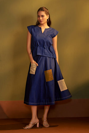 This modern co-ord set is crafted in rich denim fabric. The top features contrast stitch accents and a lightly flared structure that adds movement and shape. The A-line midi skirt is elevated with thoughtfully placed patch pockets made from linen and cotton poplin.