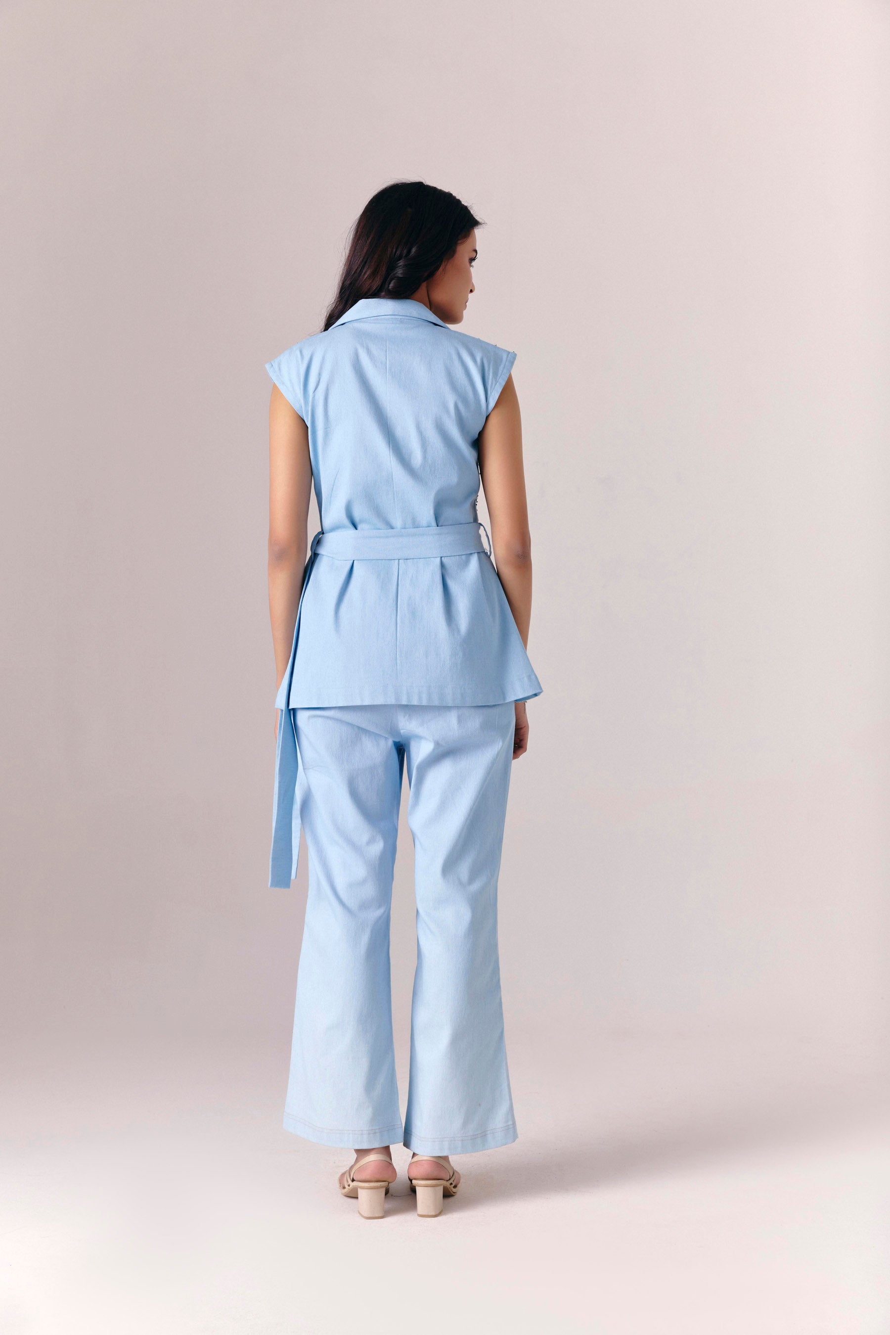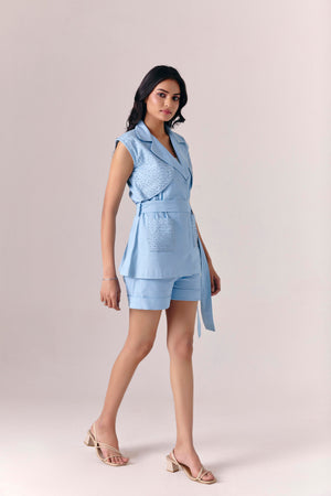This light blue denim set features a tailored jacket with sharp lapels and a belted waist, paired with straight-fit pants for a clean silhouette. Subtle stud work adds a refined touch, giving the denim a modern edge.This light blue denim set features a tailored jacket paired with matching shorts, creating a sharp yet effortless silhouette. Subtle stud work adds a refined touch, while the belted waist enhances the structured fit.